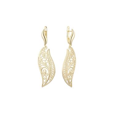 - Aжurlu sallantılı sırğalar: Yarpaq siluetində incə oyma naxışlar, zərif kontur və yüngül konstruksiya. Qulaqda uzanan elegant görünüş yaradır, gündəlikdən ziyafətə qədər müxtəlif üslublarla uyğunlaşır.