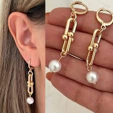 - İnci detallı zəncirvari sırğalar: Kiçik halqaya birləşən miniatür keçid elementləri və sonda sallanan sferik ağ inci. Müasir-minimal tərz, incə hərəkətlə parıldayan dekorativ vurğu.