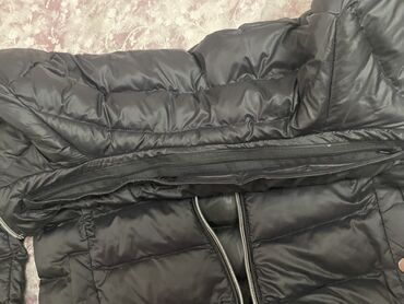 Qadın qış kurtkası – qara, kapüşonlu, süni kürk haşiyəli. - Brendlər: MS Mode (etiketdə 42 ölçü), Lolaliza – Belgian Design, Outerwear Collection (etiketdə 44 ölçü). - Uzun model, bel hissəsi yün...