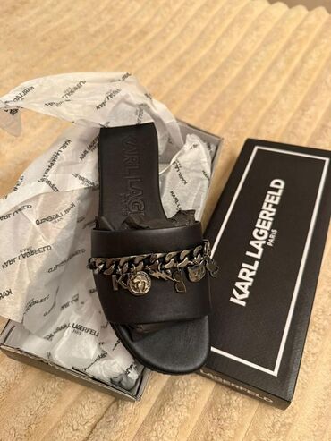 Qara rəngli Karl Lagerfeld brendinə məxsus qadın səndəlləri. Ayaqqabının üzərindəki enli qayış metal zəncirlərlə və müxtəlif Karl Lagerfeld loqotipli asqılarla bəzədilib. Bu səndəllər gündəlik geyi...