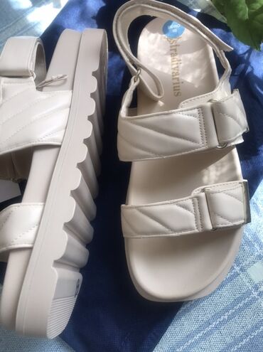 36 razmer..Bej rəngdə, dabanlı və qayışlı qadın səndəlləri. Ayaqqabıların ön hissəsində dekorativ daşlar var. Ziyafət və xüsusi günlər üçün idealdır.