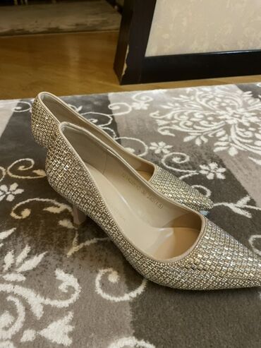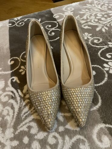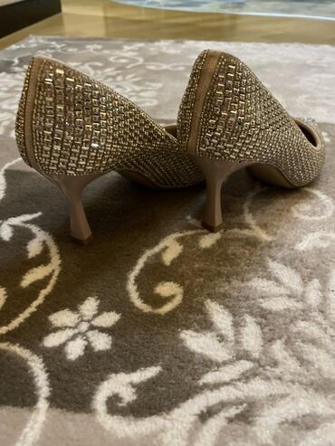 geyilmeyib. 38 razmerdir - Rəng: boz/metalik - Üst hissə: parlaq daşlarla sıx bəzədilmiş, bütün səthdə və daban hissəsində rhinestone detalları - Burun: iti (pointed toe) - Daban: nazik stilet, t...