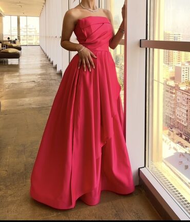 Parlaq çəhrayı rəngdə, mərasim və ziyafətlər üçün uzun axıcı don.