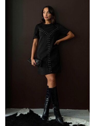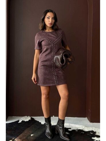 Qadın qısa əlbəttə paltar – süet effektli parça, dekorativ metal şarnir/mix bəzəklərlə