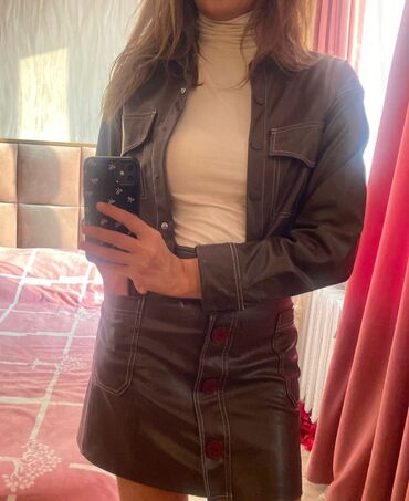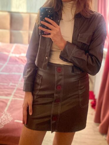 - Ətək: mini uzunluq, ön hissədə iri dekorativ düymələr (tünd qırmızı), yanlarda praktik ciblər