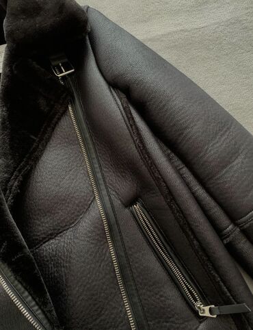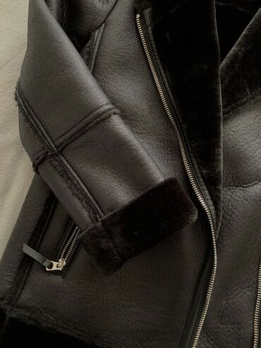 Qara rəngdə isti qış gödəkçəsi – süni dəri görünüşlü üst material və iç tərəfi tam xəz (plyuş) ilə örtülmüş. Oversize/aviasiya üslubunda kəsim, geniş xəzli yaxa və qalın xəzli manjetlər. Asimmetrik...