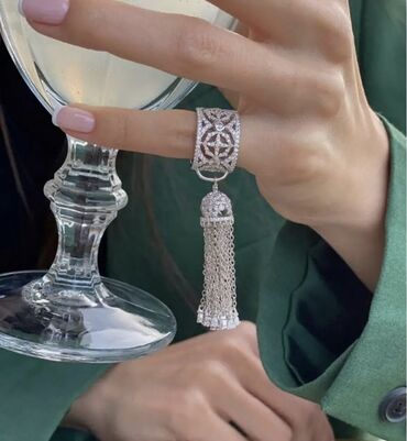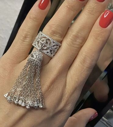 - Aksent: Üzüyə kiçik halqa ilə bağlanan sallantılı tassel (çoxsıralı zəncir saçaxları). Zəncirlərin uclarında kiçik parlaq daş başlıqlar mövcuddur, hərəkət etdikcə işıq saçır.