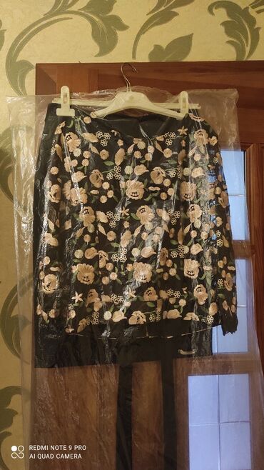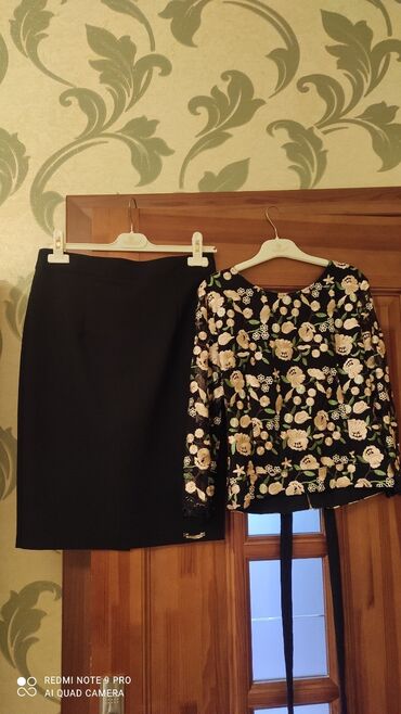 Qadın geyim dəsti - İki hissədən ibarət: uzunqollu bluz və ətək - Rəng: qara, üzərində açıq tonlarda çiçək motivləri - Bluz: V-yaxa, ön hissədə və ətək kənarında çiçək aplikasiyaları - Ətək: beldə...