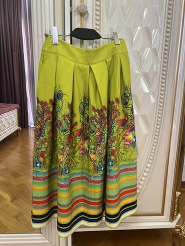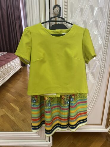 EndirimsizFıstıq rəngdə qadın ətək və top dəsti. Top qısaqollu və arxası rəngli düymələrlə bəzədilib., etek mididir pliseli və rəngli, zolaqlı naxışlıdır. Çiçək və ağac motivləri ilə bəzədilmişdir.M L arası geyinen xanımlara uyğun.1 defe istifade olunub xırda defekti bele yoxdur.ter temiz gözel materialı var.baha alınıb