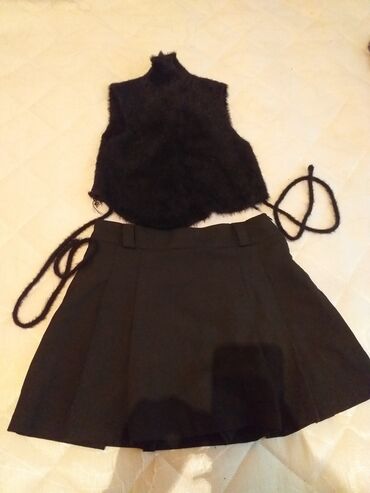 - Ətək: qısa plisse (büzməli) mini ətək, hamar parça, beldən oturan.