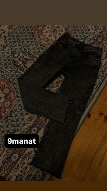 Qadın geyim dəsti – 4 məhsul 1) Cins şalvar - Marka: Aranto (etiketdə qeyd olunub) - Rəng: tünd boz/stonewash - Kəsim: düz, bir qədər geniş balaq - 5 ciblidir; ön hissədə dekorativ zəncir aksessua...