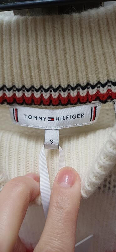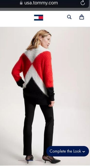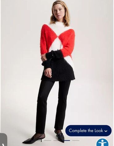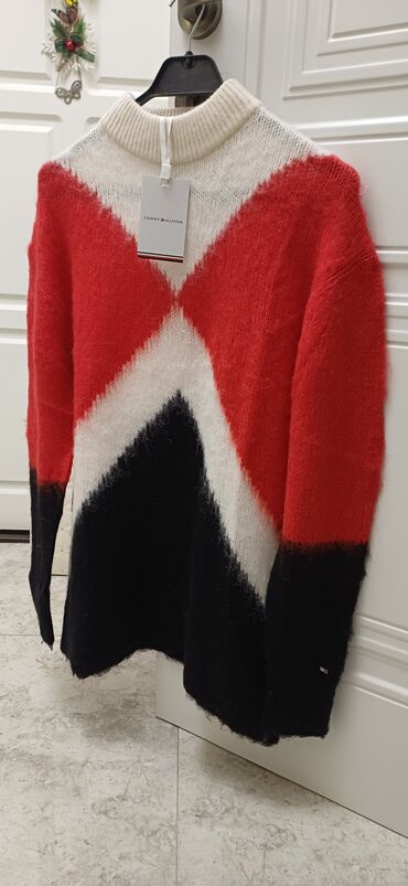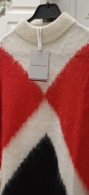 Tommy Hilfiger qadın sviteri - Model: Tommy Hilfiger, label və asqılı etiketli - Ölçü: S - Dizayn: qırmızı–ağ–qara rəng blokları, ön və arxada iri “X” formasında geometrik naxış - Yaxa: qalın rezi...