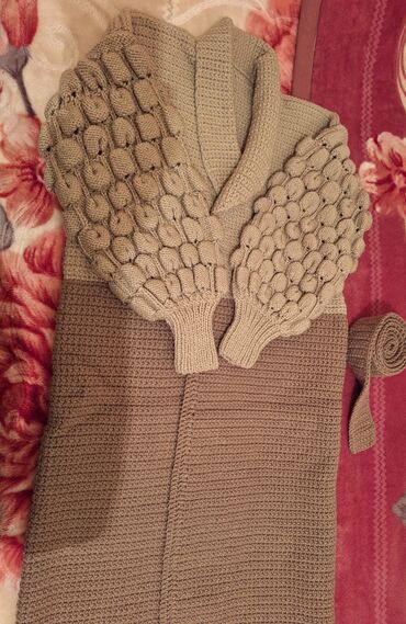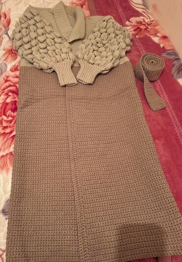 Dəst: kardiqan + toxunmuş kəmər. İsti saxlayan qalın toxunuş, unikallıq verən teksturalı qol naxışı.