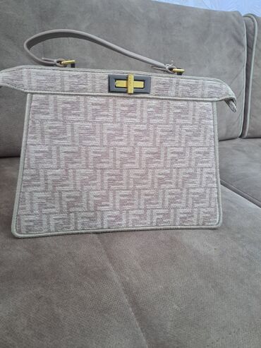 Qadın əl çantası – monoqram naxışlı, klassik siluet. - Material: sıx toxuma parça və qəhvəyi süni dəridən dekorativ detallarla - Rəng: bej/qəhvəyi palitra, üzərində təkrarlanan “F” monoqramı - Ava...