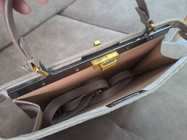 Açıq qəhvəyi rəngdə, yuxarı hissəsində metal aksesuarları olan Fendi əl çantası. Çantanın iki qısa tutacağı və tənzimlənən uzun qayışı var. Üzərində dekorativ bəzəyi olan kiçik metal loqosu mövcudd...