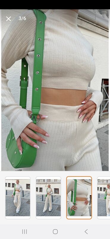 2 hissəli qadın dəsti - Üst: Açıq bej rəngdə, qısa kəsimli trikotaj sviter. Uzun qol, qollarda yaşıl aplikasiya/naxış detallar. Elastik manjet və ətək, bədənə oturan rahat fason. - Aşağı: Tünd zey...