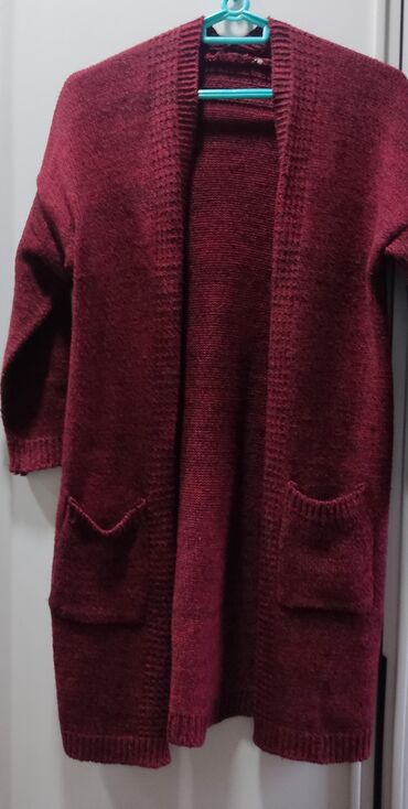 Qadın kardiqanı – bordo rəng - Model: açıq, düyməsiz kardiqan - Rəng: tünd bordo, melanj effektli - Uzunluq: omba altına qədər (uzun model) - Yaxa və ətək: rezin toxuma detallı - Qol: uzun - Ön hi...