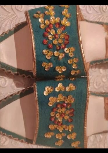 - Material: Parça üstlük, qızılı və qırmızı payetlərlə əl tikişi naxış; dəriyə bənzər altlıq.