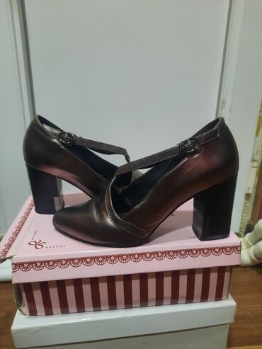 1) Tünd bürünc rəngdə, qalın hündürdaban klassik tufli