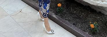 Ağ rəngli, qapalı burunlu və iti uclu qadın ayaqqabıları. Ayaqqabının ön hissəsində parıldayan qaşlarla bəzədilmiş geniş zolaq var. Daxili hissəsi bej rəngdədir və ayağın rahatlığı üçün yumşaq, yas...