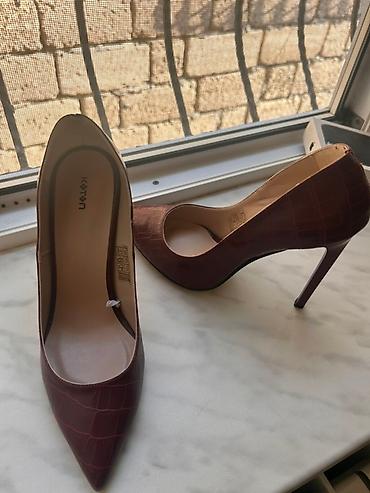 Zərif siluet və incə stilettо daban sayəsində həm ofis, həm də xüsusi günlər üçün uyğundur. Bordo tonu və krokodil teksturası kombinasiyalara dəbdəbəli vurğu qatır. Kişidən asılı olaraq qutuda etiketləri görünür (brend: Koton).