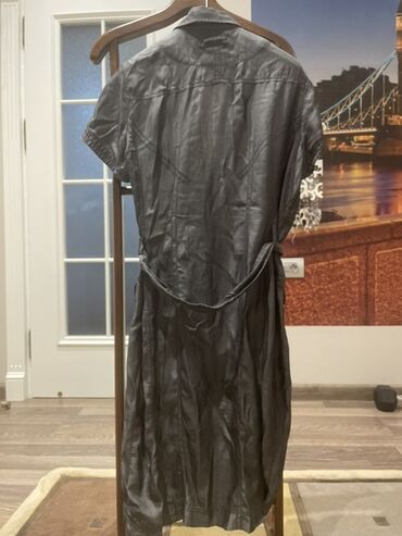 Az geyinilib KUVASZ brendinin qadın donu. - Rəng: tünd boz - Ölçü: 40 (etiketdə göstərilib) - Qısaqollu, yumru yaxa - Yan hissələrdə qara parçalı detallar və bağlama kəmər - Ön hissədə iki ədəd gü...
