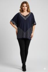 44 ölçüdür.Qadın bluzası – tünd göy rəngdə, V formalı yaxa dizaynı. Yaxanın və alt hissənin boyunca xırda gümüşü muncuq/naqxış bəzəkləri ilə ornamentlənib. Yaxanın iç tərəfində zərif güllü krujeva detalı var. Qısa qol, rahat kəsim; aşağı hissədə “V” forması ilə bədənə yığcam düşən görünüş yaradır. Gündəlik və ya axşam kombinləri üçün uyğundur, cins, ətək və klassik şalvarla rahat uyğunlaşır. Rəng: tünd göy. Dizayn: muncuq bəzəkli, krujevalı V-yaxa, qısa qol. Stil: şık və rahat.