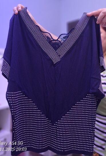 44 ölçüdür.Qadın bluzası – tünd göy rəngdə, V formalı yaxa dizaynı