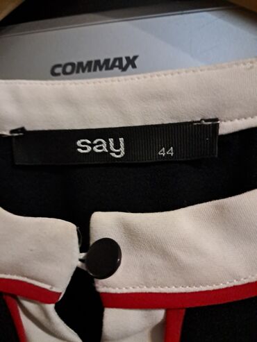 - Dizayn: Qara əsas rəng üzərində ağ detallar və qırmızı boru (piping) vurğuları. Ön hissədə ağ planка və qara düymələr, dairəvi yaxa. Yanlardan aşağı doğru uzanan qırmızı xəttlər bədəni incə göstərən kəsim effekti yaradır.