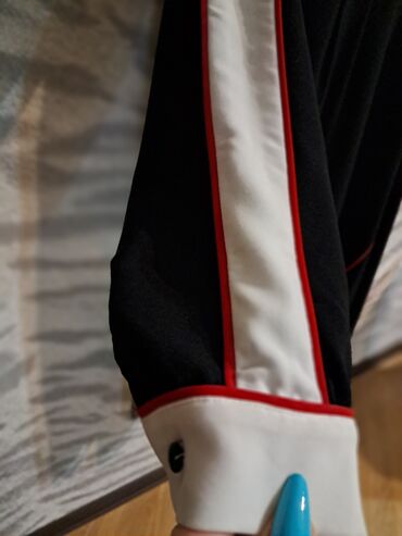 - Qol: 3/4–tam uzunluğa yaxın qollar; üst hissədə ağ zolaq və qırmızı haşiyə, ağ manjetlərdə dekorativ düymə.
