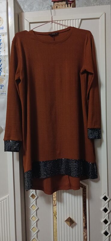 Dəst bütöv şəkildə verilir: üst tunik + uyğun şalvar. Rahat ölçülü kəsim və neytral rəng palitrası ilə payız-qış mövsümü üçün uyğundur.