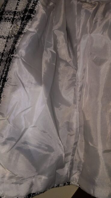 Qadın tweed gödəkçə - Material: qalın, toxunma tweed parça (yaşıl-qara rəng çalarları, zolaqlı/çəp naxış). - Daxili: bənövşəyi rəngdə naxışlı astar. - Yaxa: asimmetrik kəsim, böyük düymə ilə bağla...