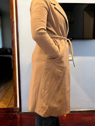 Qadın palto – bej/kamel rəng - Kəsim: açıq önlü, yüngül oversize siluet, beldən kəmərli (kəmər arxadan keçidlidir) - Yaxa: geniş şal yaxa - Uzunluq: dizə yaxın/orta uzunluq - Material: yumşaq toxu...