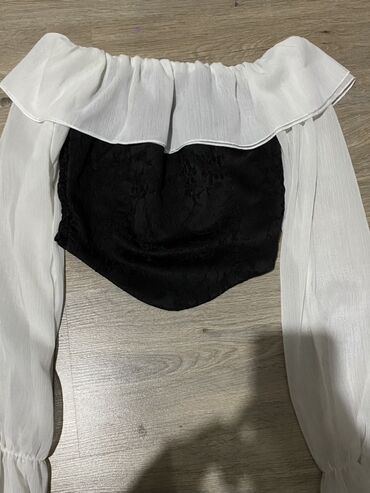 Qadın köynəyi/bluzu – qara gövdə, ağ rəngli uzun qol detalları ilə. - Stil: Kontrastlı dizayn, yüngül oversize/boxy kəsim, qısa uzunluq (cropped tərzdə). - Yaxa: Dairəvi (crew neck). - Qollar: Uzun...