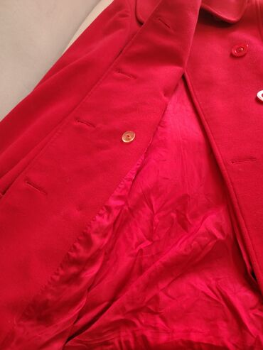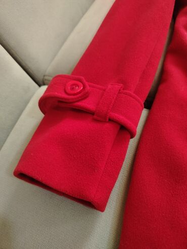 Qırmızı qadın palto - Ölçü: S (36) - İstehsal: Türkiyə - Model: düz kəsim, dizə yaxın uzunluq - Bağlanma: ön hissədə 4 düymə - Ciblər: ön tərəfdə qapaqlı 2 iri yamaq cib - Material: yumşaq toxumal...