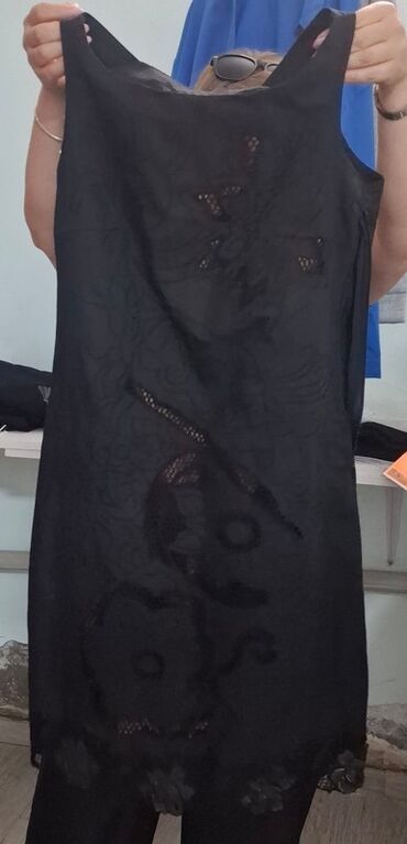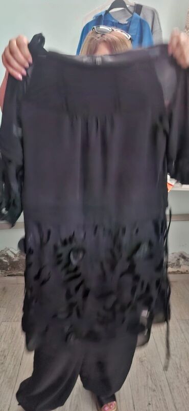 Qara axşam geyimi – uzun, zərif model 46 razmer. 44 razmerə də gedər. - Rəng: qara - Siluet: uzun, axıcı, ikiqat şifon ətək hissəsi ilə - Üst hissə: gül aplikasiyalı teksturalı dekor və xırda mun...