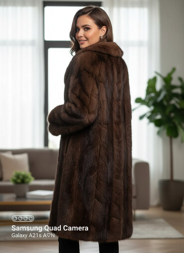 Qadın kürkü – tünd qəhvəyi/qaraya yaxın rəng, uzun modellidir. Xüsusiyyətlər: - Klassik düz kəsim, dizdən aşağı uzunluq - Yumşaq, sıx tüklü parlaq faktura - Geniş, qatlana bilən yaxalıq - Uzun qol...