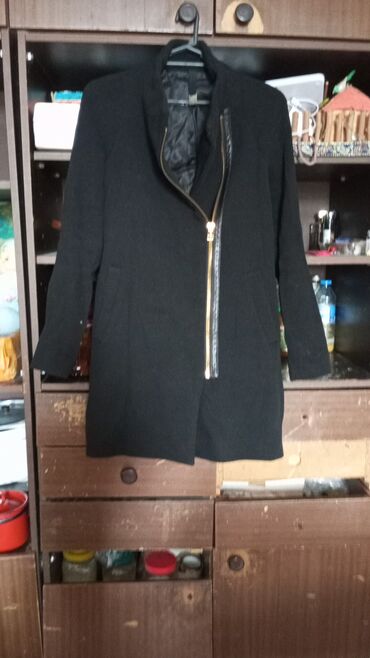 3) Klasik qara palto – minimalistik kəsim, asimmetrik qızılı rəngdə yan fermuar, iki yan cib, astarlı içlik. Ofis və gündəlik kombinlərə uyğun.