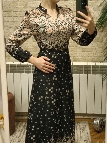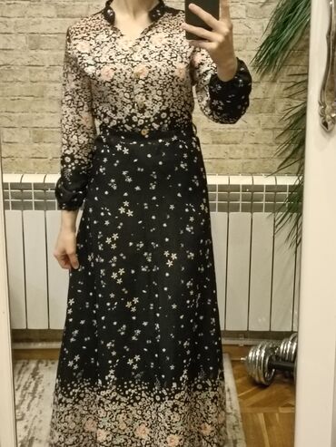 - Etek: A-kəsim, ayağa qədər uzun, xırda ulduz və çiçək naxışlarının aşağıya doğru sıxlaşan ombre effekti
