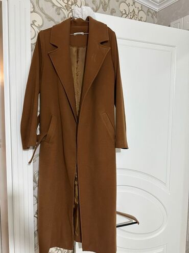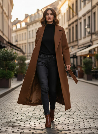 Qadın palto – tünd qəhvəyi rəng - Klassik dizayn: geniş yaxalıq, ətəyə doğru düz kəsim - Qurşaqla bağlanır, belin vurğulanması üçün çıxarıla bilən kəmər - Gizli düyməsiz ön hissə, təmiz və minimal...