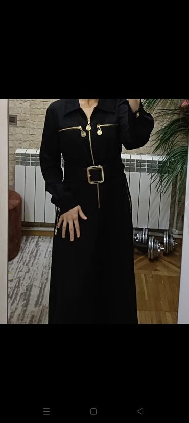 - Kəmər: eni geniş, qara parçadan, iri qızılı rəngli kvadrat tokalı – beli vurğulayır və ölçünü tənzimləməyə imkan verir.
