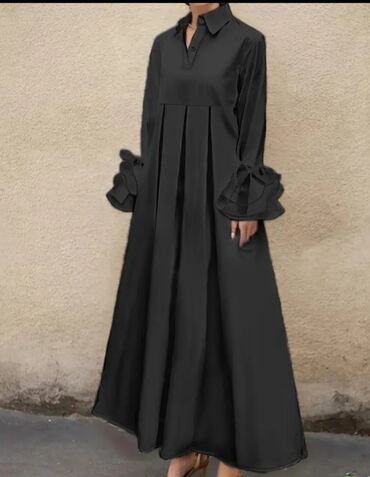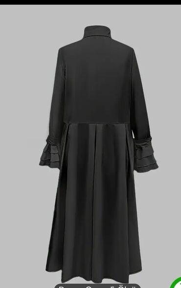 Qara rəngli gündəlik, həm şəhər, həm də istirahət üçün uyğun uzun qara don - Model: qat-qat ətəkli, oversize kəsim - Yaxa: V-yaxa ön hissə, arxa hissə yuvarlaq - Qol: dirsəkdən aşağı enli, rahat q...