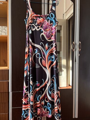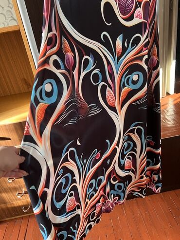 - Dizayn: Qara fon üzərində rəngarəng, abstrakt-botanik naxışlar (mavi, narıncı, çəhrayı və krem tonları). Geniş, axıcı print bütün səthi əhatə edir.
