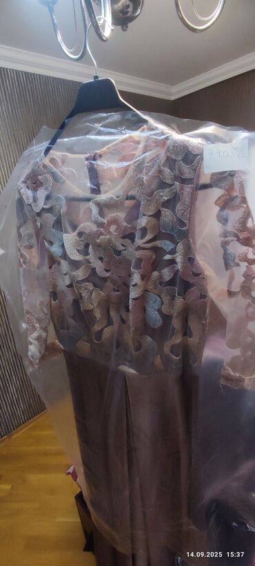 Brend: SAKA Model: Uzun ziyafət/abiyə don - Rəng: Dərin bənövşəyi - Kəsim: Uzun, düz siluet; dairəvi yaxa - Üst hissə: Asimmetrik tül pelerin. Pelerinin kənarları xırda daşlarla bəzədilib, sağ tər...