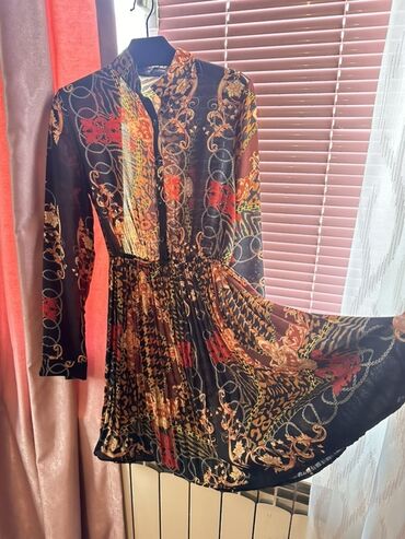 Qadın paltarı – uzunqol, boğazı balaca stendlidir. Qara əsas fon üzərində qızılı, tunc, narıncı və qırmızı tonlarda barokko və zəncir motivli qarışıq print. Öndən düyməlidir, bel hissəsi rezinli/şnurla yığılmışdır, aşağı hissəsi plissəlidir və ətəyi yüngül, hərəkətli duruş yaradır. Parça nazik və axıcıdır, şəffaf effektli uzun qollarla. Dizin üstündə midi/mini uzunluq. Şəhər stilindən tutmuş axşam çıxışlarına qədər həm gündüz, həm də xüsusi günlər üçün uyğundur. Qara topuq çəkmələri və ya zərif ayaqqabılarla asanlıqla kombinlənir. Rəng palitrası payız-qış çalarları ilə harmonikdir, zərgərliklə vurğulamaq üçün əlverişlidir.
