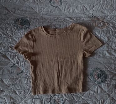 Qadınlar üçün qolsuz ribli top - Model: kvadrat dekolteli, qısa kəsimli (crop) top - Rəng: bej/şaftalı tonları - Parça: elastik, incə şaquli rib toxuma; bədənə oturan - Dizayn detalları: qalın ask...
