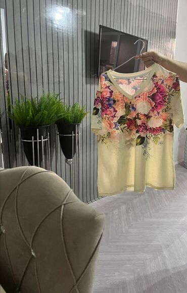 Narıncı rəngli qadın T-shirt Mrazmer - Yumşaq, nazik trikotaj parça - V-yaxa, qısa qol - Ön hissədə çiçəkli əl işi tərzində aplikasiya və print: çətir, rezin çəkmələr, çanta və termos/fincan motiv...