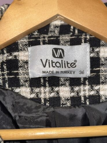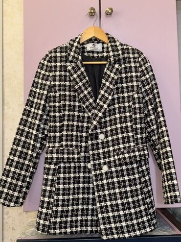 Qadın/blazer tipli qısa jaket - Rəng: tünd boz (yüngül melanj toxuma) - Model: Klassik qısa kəsim, çevik çiyin xətti - Yaxa: Düz/klassik yaxalıq - Bağlanma: Öndə iri dekorativ düymələr (4 ədəd) - ...