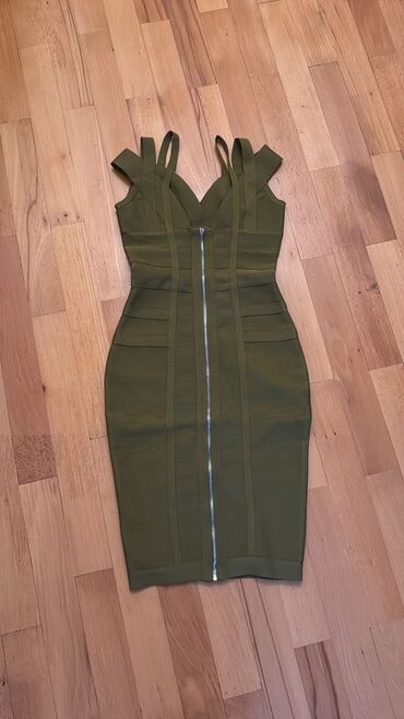 Xaki-yaşıl bandaj don - Model: bədənə oturan midi siluet, qaləm etek