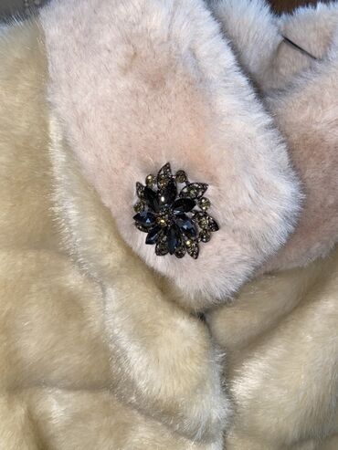 Real müstəriyə endirim olunacağ Zərif xanım kürkü – krem/bej rəngdə, dizə qədər uzunluq. Üfüqi panellərlə işlənmiş yumşaq tüklü faktura, iri və isti stend-yoqa (stoyka) yaxa. Yaxada qara və tünd şampan rəngli daşlardan dekorativ broş/çəngəl bərkidici. Gizli ön bağlanma, iki yan cib. İç hissə atlas/parlaq astarlı. Aşağı ətək hissəsində və yaxada eyni rəngli, daha sıx tüklü haşiyə. Ölçü: XL (etiketdə göstərilib). Şık, klassik siluet, gündəlik və xüsusi tədbirlər üçün uyğundur.